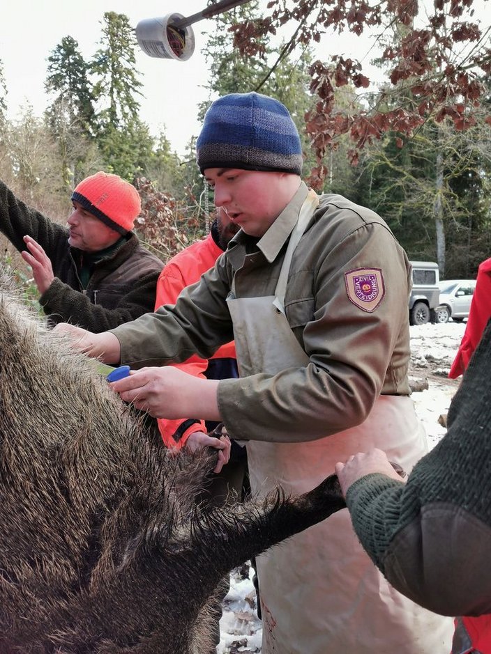 Stellvertretend für alle Helfer nenne ich hier Paul Müller, der als Metzgerlehrling sein bisheriges Können beim Aufbrechen fleißig unter Beweis gestellt und seinem Ausbildungsbetrieb alle Ehre gemacht hat.